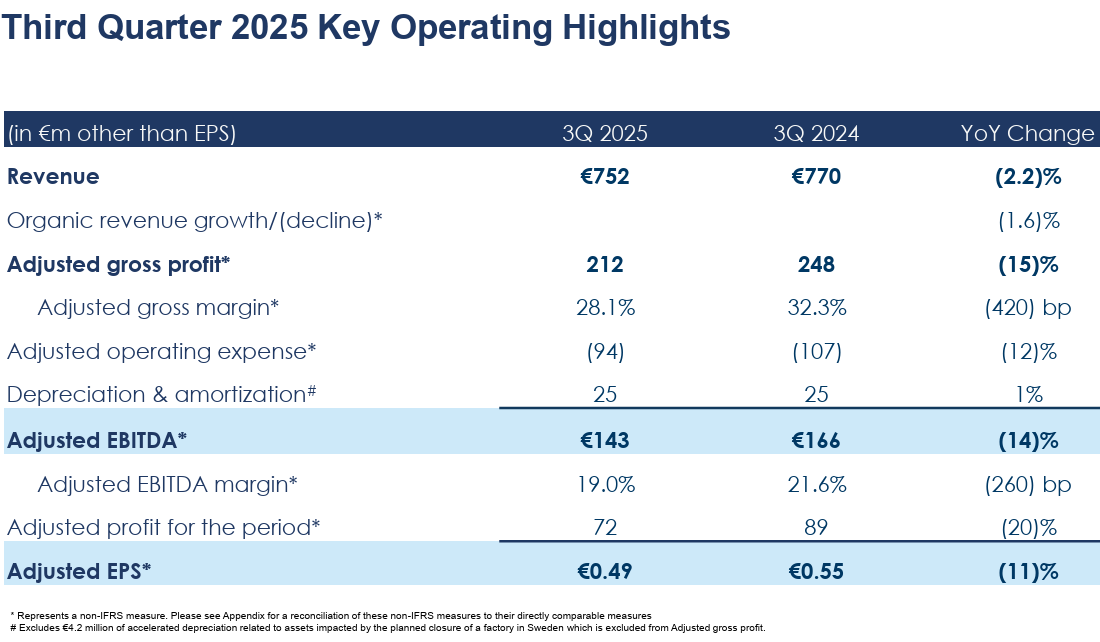 For the first nine months of 2025, revenue decreased 2.0% to €2.259 billion, and Adjusted EBITDA decreased 8.4% to €392 million.