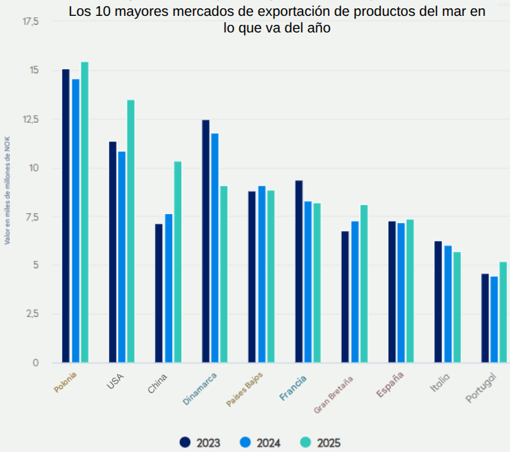 En lo que va de año, Noruega ha exportado mariscos por valor de aproximadamente $13,410 millones de US$ (149,000 millones de NOK), un aumento del 4.2 por ciento con respecto al mismo período del año anterior. Polonia, los EE. UU. y China son los mercados más grandes en lo que va de año, destacándose China como el mercado de mayor crecimiento en términos de valor.