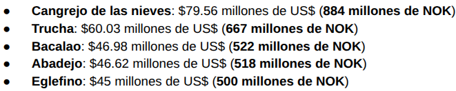 Las exportaciones acumuladas de productos del mar han aumentado en aproximadamente $540 millones de US$ (6,000 millones de NOK). Este aumento se atribuye principalmente a un incremento de $216 millones de US$ (2,400 millones de NOK) en el valor de exportación de salmón. Otros contribuyentes significativos al crecimiento anual incluyen: