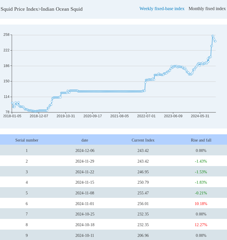 Combined with the upward trend of the monthly price index and the index performance of each week of last month, the weekly price index of squid in the Indian Ocean this month has obviously tended to be stable. The index closed at 243.42 points at the end of November, down 4.92% from the end of October.