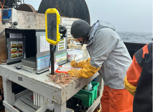 Los científicos recolectan muestras de hepatopáncreas del cangrejo de las nieves para monitorear las reservas energéticas de los juveniles de cangrejo de las nieves durante el estudio de arrastre de fondo del este del Mar de Bering de 2023. Crédito: Pesca NOAA / Emily Markowitz