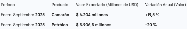 Liderazgo Histórico: Por primera vez, un producto no petrolero —el camarón— ha liderado el acumulado de exportaciones del país durante nueve meses de un año.