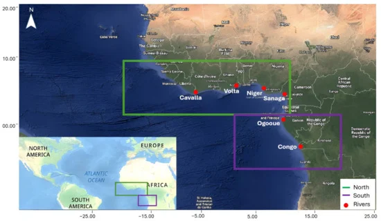Mapa que muestra la ubicación del estudio, donde el área de estudio "Norte" está resaltada en verde y el "Sur" en morado. La detección y los métodos de detección de sargazo se realizaron únicamente en áreas oceánicas; los recuadros representan los límites de las imágenes satelitales cuadriculadas utilizadas para la detección. La ubicación de los principales ríos que se unen al Atlántico también se indica con puntos rojos.