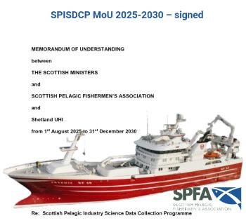 Un Memorandum of Understanding (MoU) y un Acuerdo de Intercambio de Datos han sido firmados entre los Scottish Government Ministers, actuando a través del Marine Directorate, la Scottish Pelagic Fishermen’s Association (SPFA) y UHI Shetland para coordinar el Scottish Pelagic Industry Science Data Collection Programme (SPISDCP).