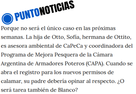 Y continúa Garrone «El obstáculo lo saltearon con la firma de Gabriel Blanco, titular de la Dirección de Pesquería de Peces, que determinó que los congeladores al norte no tendrían un impacto significativo sobre la pesquería de calamar (…) Sí afectaría la fragilidad del stock reproductivo de merluza del efectivo al norte del 41ºS y de ahí que tacharon el acceso a los buques factorías de “Tony” (NdA: Antonio Solimeno). Esa conclusión también se incluyó en la firma de Blanco. Si lo hacía la Jefa de Merluza, Gabriela Irusta, también entrábamos en otro terreno sensible. Es la mamá de Ottito. Que difícil todo (…) Porque no será el único caso en las próximas semanas. La hija de Otto, Sofía, hermana de Ottito, es asesora ambiental de CaPeCa y coordinadora del Programa de Mejora Pesquera de la Cámara Argentina de Armadores Poteros (CAPA). Cuando se abra el registro para los nuevos permisos de calamar, su padre debería opinar al respecto. ¿O será también una tarea de Blanco?».